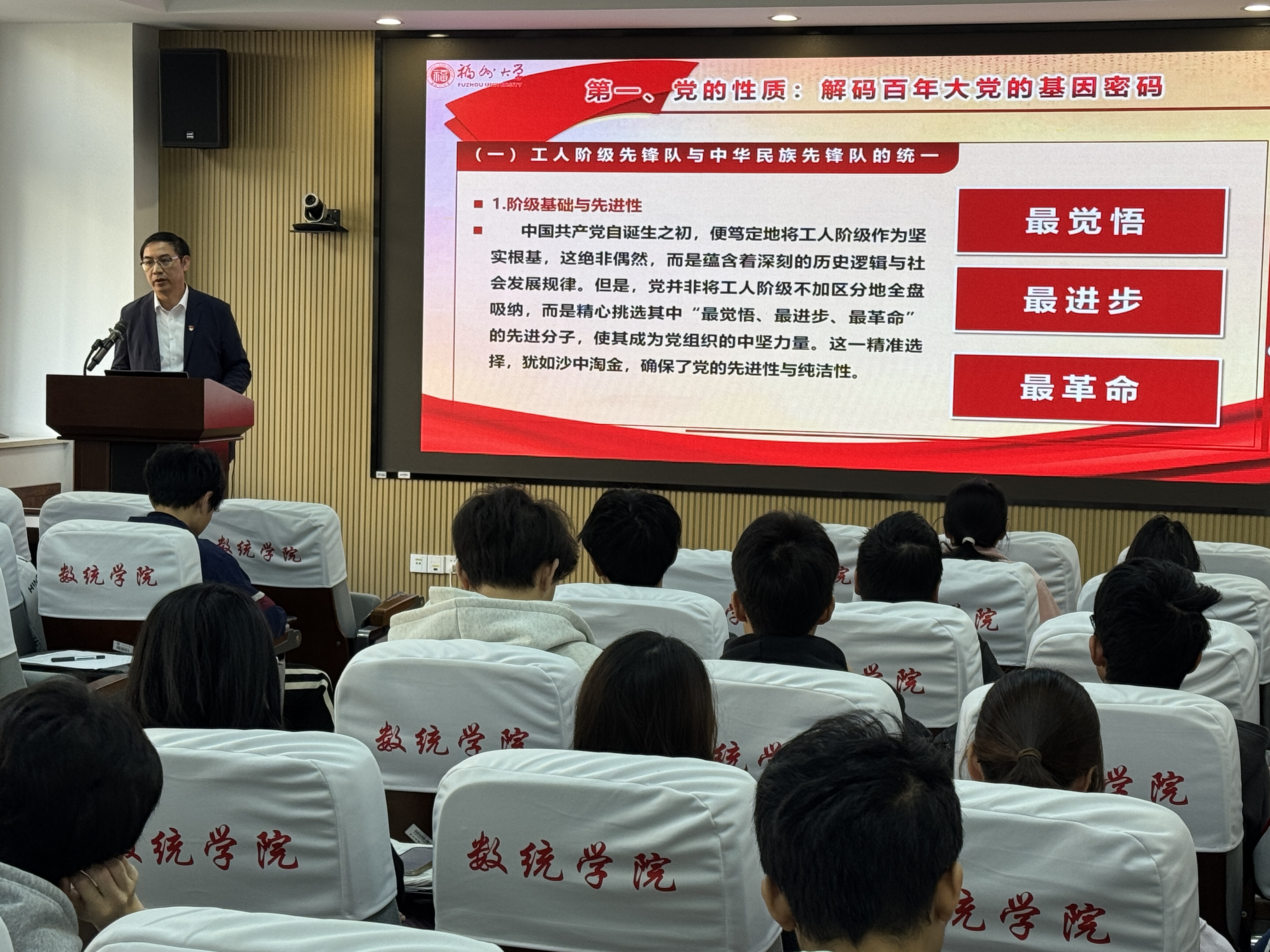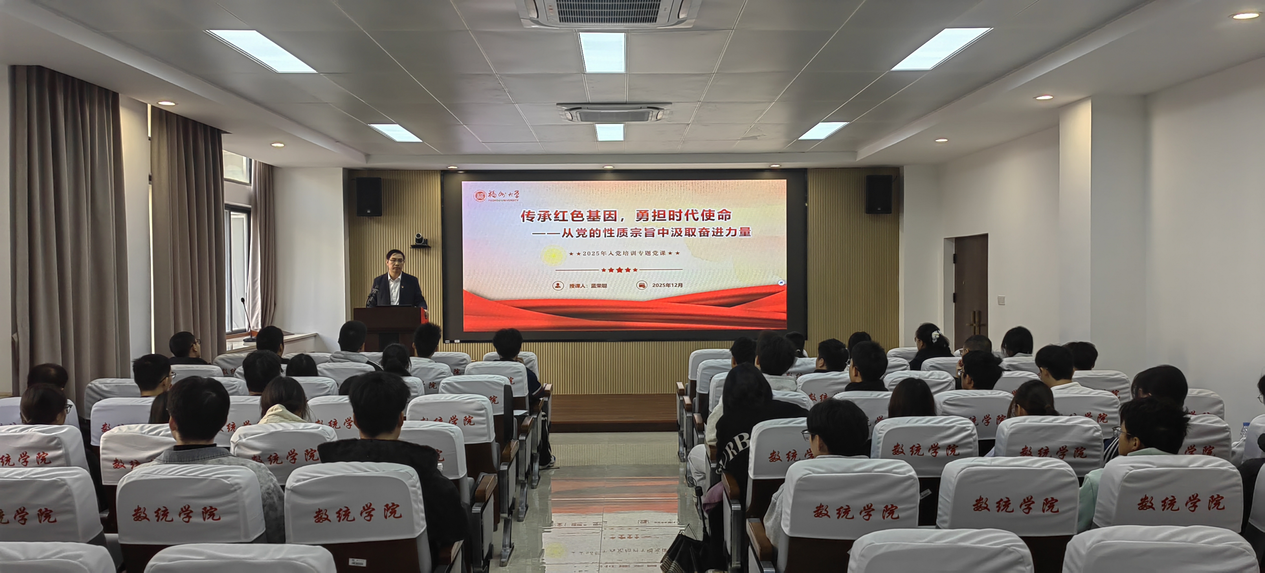 党委副书记蓝荣聪在学院208报告厅,为2025年秋季学期入党积极分子培训班学员讲授“传承红色基因 勇担时代使命”的专题党课(思政课)。